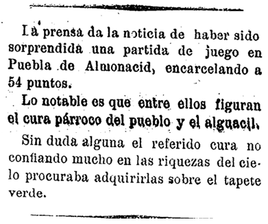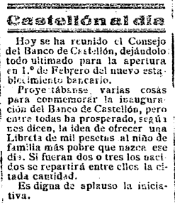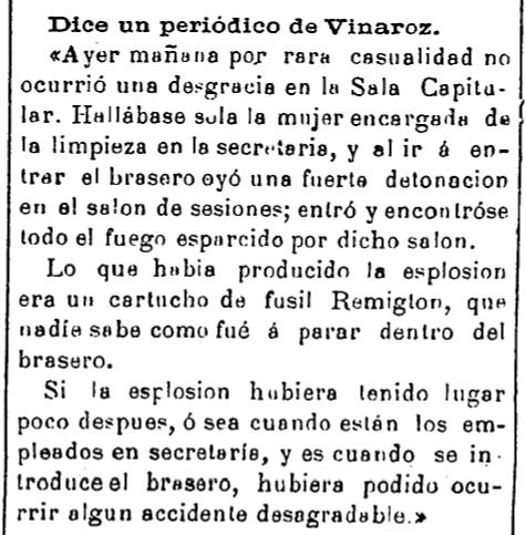 El último jueves de enero de 1886, La Provincia da cuenta de una noticia recogida en «un periódico de Vinaroz», según la cual la mujer encargada de la limpieza en la secretaría municipal del Ayuntamiento de Vinaròs, «al ir a entrar el brasero oyó una fuerte detonación en el salón de sesiones». Al entrar, «encontróse todo el fuego esparcido por dicho salón».