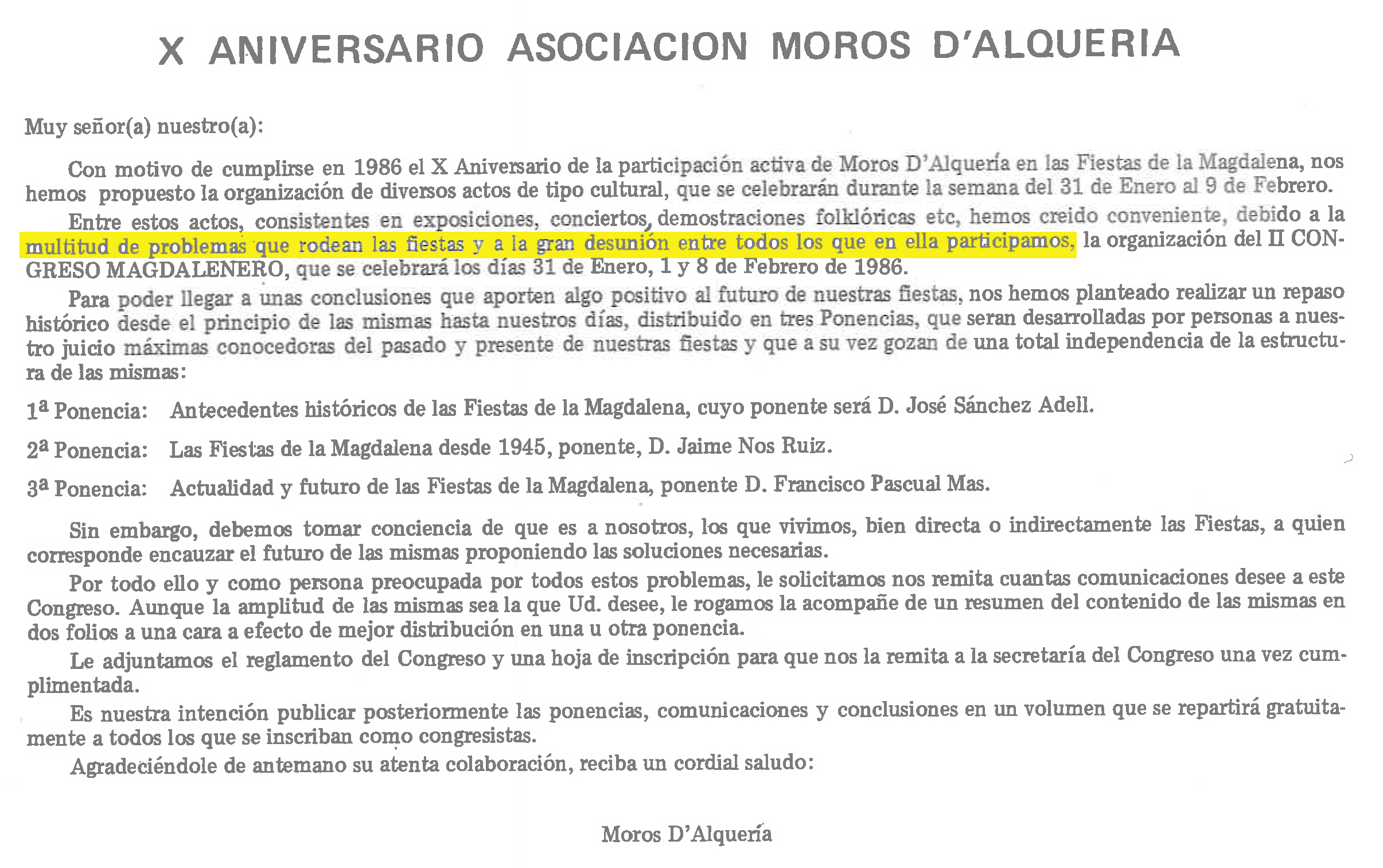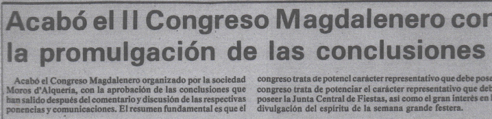 Pasaron ocho años, llegó 1986 y la Asociación Moros d’Alqueria, en el marco de la celebración de su décimo aniversario, convocó el II Congreso Magdalenero, que de este modo se proclamaba continuador de la saga, legitimando de facto la sucesión de estos encuentros para la reflexión en torno a las fiestas fundacionales.