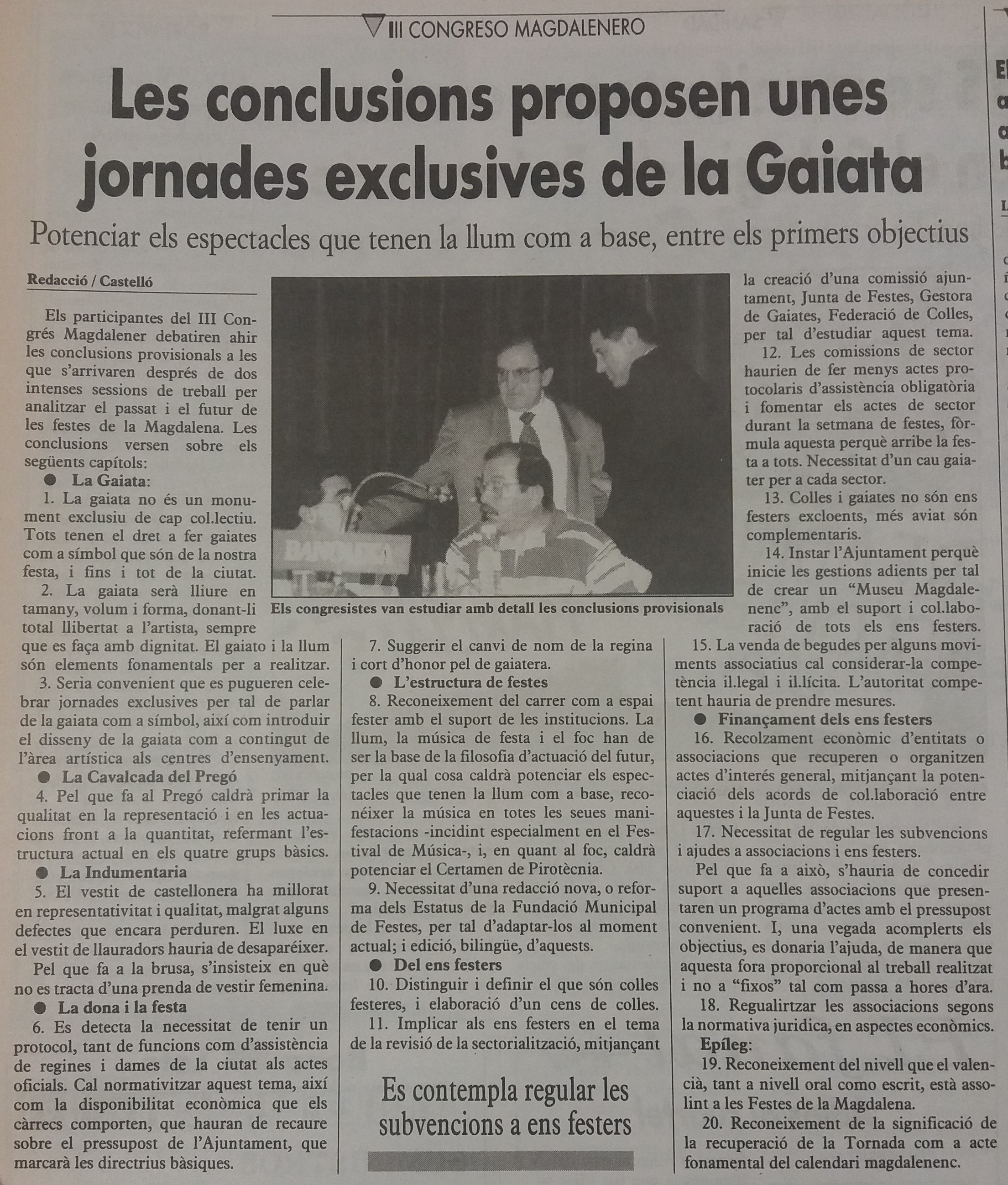 No obstante, sin duda lo más trascendente fue la inclusión en las conclusiones de un párrafo que ponía deberes al Ayuntamiento de Castellón y que, a la luz de los hechos posteriores, resultaría profético: «Sobre la base del derecho y deber del Ayuntamiento en lo referente a las fiestas, como una más de sus obligaciones, se entiende que la Junta de Fiestas, que actúa por delegación del municipio, debe tener un carácter absolutamente representativo. Se entiende que esta Junta representa a toda la organización de las fiestas y por tanto, debe reunir a todos los estamentos que la integran. Este aspecto representativo se considera fundamental, y el primer paso es la urgente revisión, actualización y aplicación de sus estatutos«.