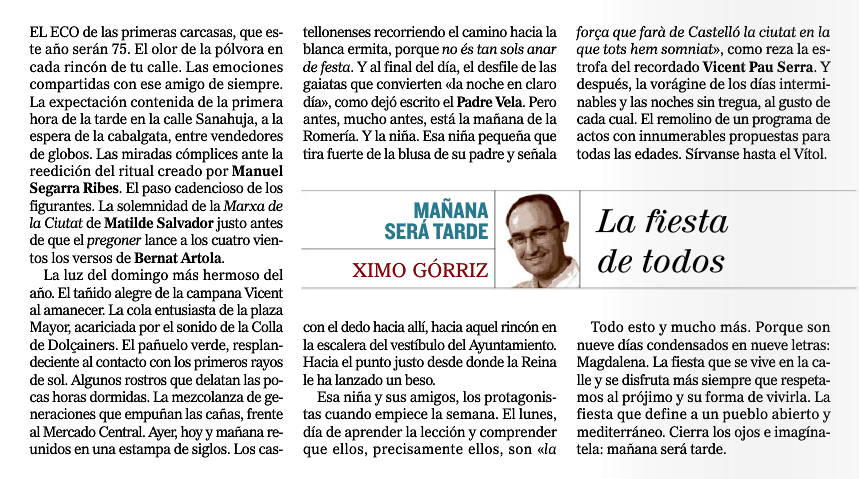 Esta entrada fue publicada en Opinión, Periodismo, Prensa y etiquetada Bernat Artola, El Mundo Castellón al día, fiestas de la Magdalena, Magdalena, Manuel Segarra Ribés, Matilde Salvador, Romería, Vicent Pau Serra. Guarda el enlace permanente.