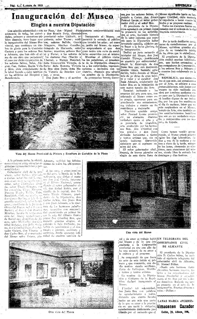 Con «elogios a nuestra Diputación», el diario República informaba, tal día como hoy de 1934, sobre la inauguración del Museo Provincial de Castellón, celebrada la víspera, domingo 7 de enero. El periódico subrayaba sobre todas las cosas el papel desempeñado en el impulso del proyecto por el escultor Juan Bautista Adsuara y por el marchante alcorino Justo Bou, hermano del pintor Cristóbal Bou, fallecido dos años y medio antes. (Nota: pulsar sobre la imagen para leer la noticia con nitidez).