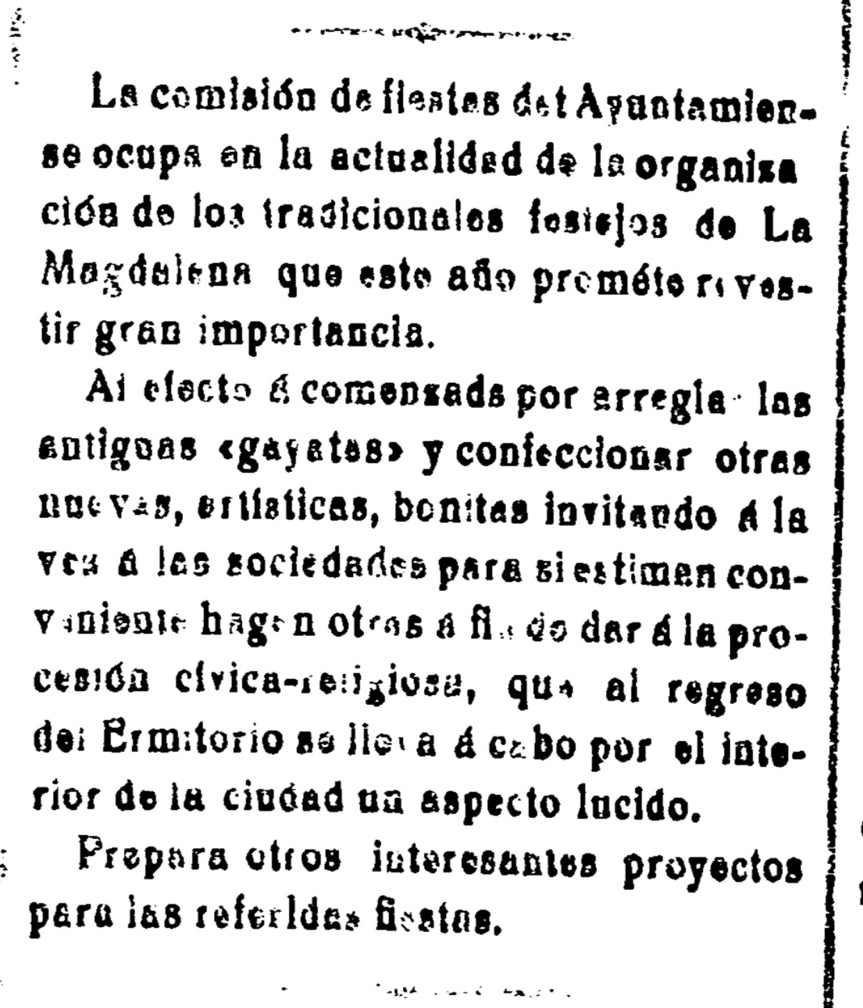 Tal día como hoy de 1914, La Provincia informaba sobre las iniciativas de una comisión de fiestas del Ayuntamiento de la capital para la organización de «los tradicionales festejos» de la Magdalena, por aquel momento limitados a la romería, la procesión de penitentes y el desfile de gayatas, amén de la feria taurina.