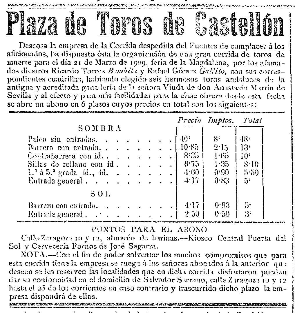 Tal día como hoy de 1909, Heraldo de Castellón anunciaba el cartel de la «gran corrida de toros de muerte» que había de servir de despedida de la plaza de toros de Castellón del sevillano Antonio Fuentes Zurita. Sus compañeros en el paseíllo del domingo de la Magdalena, 21 de marzo, serían Ricardo Torres Reina, Bombita Chico, y Rafael Gómez Ortega, Gallito (biografías de la Real Academia de la Historia). En el reclamo publicitario se explica que «para más facilidades para la clase obrera se abre un abono en 6 plazos», del que se detallan los precios.