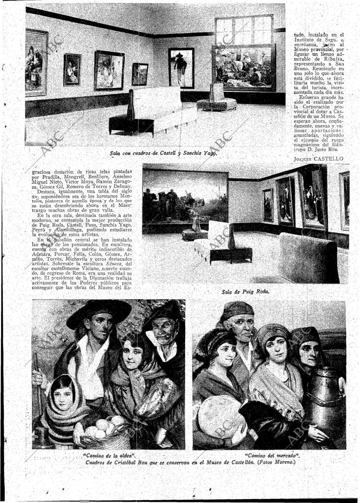 La inauguración, el 7 de enero de 1934, del nuevo Museo Provincial de Castellón, era objeto de un amplio reportaje 12 días más tarde, tal día como hoy, en el periódico ABC. Firmada por el periodista Joaquín Castelló, la pieza cuenta en detalle, en dos páginas, todos los detalles del centro cultural, con grandes elogios a sus impulsores: el presidente de la Diputación Provincial, Carlos Selma, el escultor Juan Bautista Adsuara y el «filántropo y paladín incansable» Justo Bou, marchante de arte y hermano del fallecido pintor Cristóbal Bou. En el amplio despliegue fotográfico del reportaje, se destacan las salas dedicadas a Vicent Castell Doménech y Rafael Sanchis Yago, así como a Gabriel Puig Roda., así como sendas obras del citado Bou.