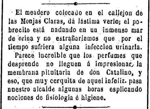 Tal día como hoy de 1879, La Alborada recurría al sarcasmo contra «la membrana pituitaria de don Catalino» (Alegre Renau), alcalde de la ciudad y para más señas, catedrático de Ciencias Naturales del instituto de Castellón, por entonces situado en la actual plaza Santa Clara. El periódico decía que el «meadero» ubicado junto al instituto estaba «nadando en un inmenso mar de orina» y temía porque pudiera adquirir «alguna infección urinaria». Al redactor del suelto le parecía «increíble» que los «perfumes» que se desprendían del lugar pasaran inadvertidos para Alegre, pese a pasar «muy cerquita» varias horas al día «esplicando (sic) nociones de fisiología e higiene».