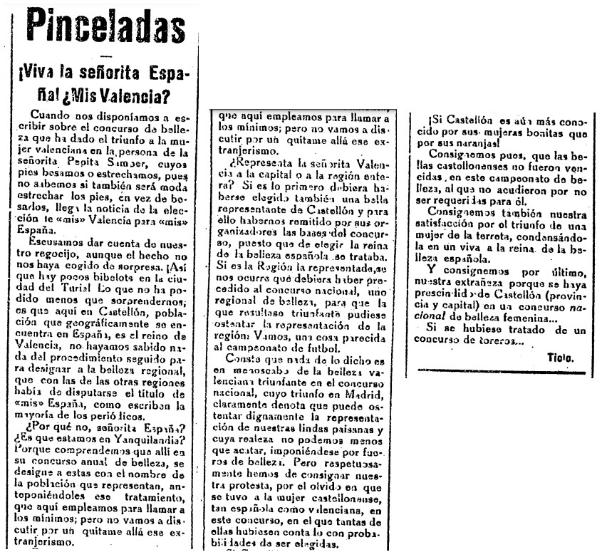 La elección de la valenciana Pepita Samper como Señorita España -precedente de Miss España- en un acto en el diario ABC de Madrid, el 25 de enero de 1929, provocaría una reacción airada de Heraldo de Castellón, publicada cuatro días después. En su comentario, el periódico castellonense se preguntaba si la ganadora había representado a la ciudad de Valencia «o a la región entera», dado que en Castellón no se había tenido noticia alguna «del procedimiento seguido para designar a la belleza regional, que con las de otras regiones había de disputarse el título de mis España». Aún mostrando su satisfacción «por el triunfo de una mujer de la terreta» (en la foto inferior), el periódico se preguntaba: «¿es que estamos en Yankilandia?» y defendía que Castellón «es aún más conocida por sus mujeres bonitas que por sus naranjas».