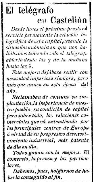 «Todos ganan con la mejora. El comercio, la prensa y los particulares». Así celebraba Heraldo de Castellón, tal día como hoy de 1904, la implantación del «servicio permanente» en la estación telegráfica de la ciudad, que hasta ese momento sólo funcionaba dos horas diarias, de 7 a 9 de la mañana. Una «necesidad imperiosa» impulsada por varios motivos: «la importancia de nuestro pueblo, su condición de capital pero sobre todo, las relaciones comerciales» con «los principales centros de Europa», impulsadas por el crecimiento de la industria.