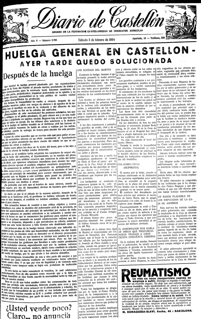 La solución de una huelga general provocada por la desesperada situación del desempleo obrero era anunciada con alegría por la prensa local tras unos días de verdadero desasosiego en la ciudad. Tal día como hoy de 1934, Diario de Castellón, periódico de la Federación Castellonense de Sindicatos Agrícolas, daba cuenta del desenlace de unos días con graves consecuencias. La más trágica, la muerte de un camarero del Círculo Mercantil, Juan Royo Royo, alcanzado por un disparo en una carga de las fuerzas policiales contra los manifestantes, cerca del edificio de Correos.