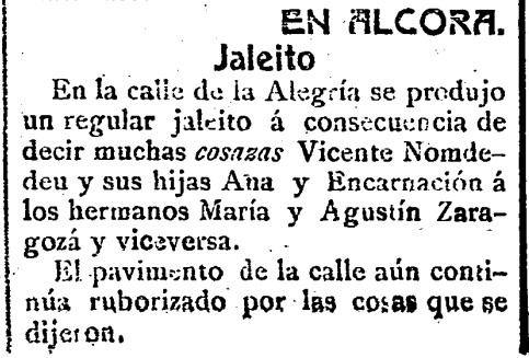Los lectores de Heraldo de Castellón se enteraban de este modo, tal día como hoy de 1909, del «regular jaleíto» que se había producido en la calle de la Alegría de l’Alcora (hoy calle José Gil Castillo). Según el irónico suelto del diario, un padre y sus hijas, por un lado, y dos hermanos, por otra, se habían dicho «muchas cosazas«, de tal gravedad que «el pavimento de la calle aún continúa ruborizado».