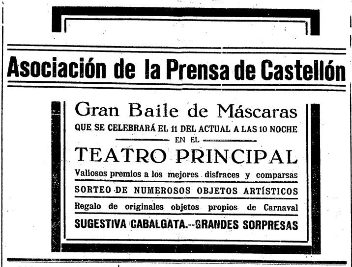 En las primeras décadas del siglo XX, la Asociación de la Prensa de Castellón exhibía poder de convocatoria e influencia social con actividades como la anunciada por Heraldo de Castellón para el 11 de febrero de 1929: nada menos que un carnavalesco «gran baile de máscaras» en el Teatro Principal, con ingredientes como «valiosos premios» a disfraces y comparsas, sorteos, regalos, una «sugestiva cabalgata» y «grandes sorpresas».