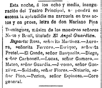 El jueves 15 de febrero de 1894, El Clamor de Castellón anunciaba así el reparto de la compañía encargada nada menos que de inaugurar, con la zarzuela El Ángel Guardián, el nuevo Teatro Principal de Castellón, el anhelado coliseo de la plaza de la Paz. Su construcción suponía la culminación de un proyecto acariciado durante décadas por la ciudad, el cumplimiento de un anhelo que se identificaba como signo de progreso.