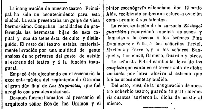 Tres días después, el mismo periódico calificaba de «acontecimiento» la jornada inaugural, y se refería al aspecto de un «soberbio» teatro «materialmente invadido por una multitud de gente». Asimismo, se hacía eco de la «calurosa ovación» que «como premio a sus talentos» habían recibido el arquitecto Godofredo Ros de Ursinos y el pintor escenógrafo valenciano Ricardo Alós.
