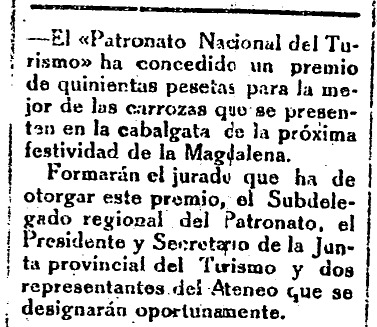 El Patronato Nacional de Turismo fue un organismo creado en 1928, durante la dictadura de Miguel Primo de Rivera, y que desaparecería con el inicio de la Guerra Civil. Tal día como hoy, Heraldo de Castellón anunciaba la concesión de un galardón dotado con nada menos que 500 pesetas «para la mejor de las carrozas que se presenten en la cabalgata de la próxima festividad de la Magdalena», en referencia a la Romeria de les Canyes.