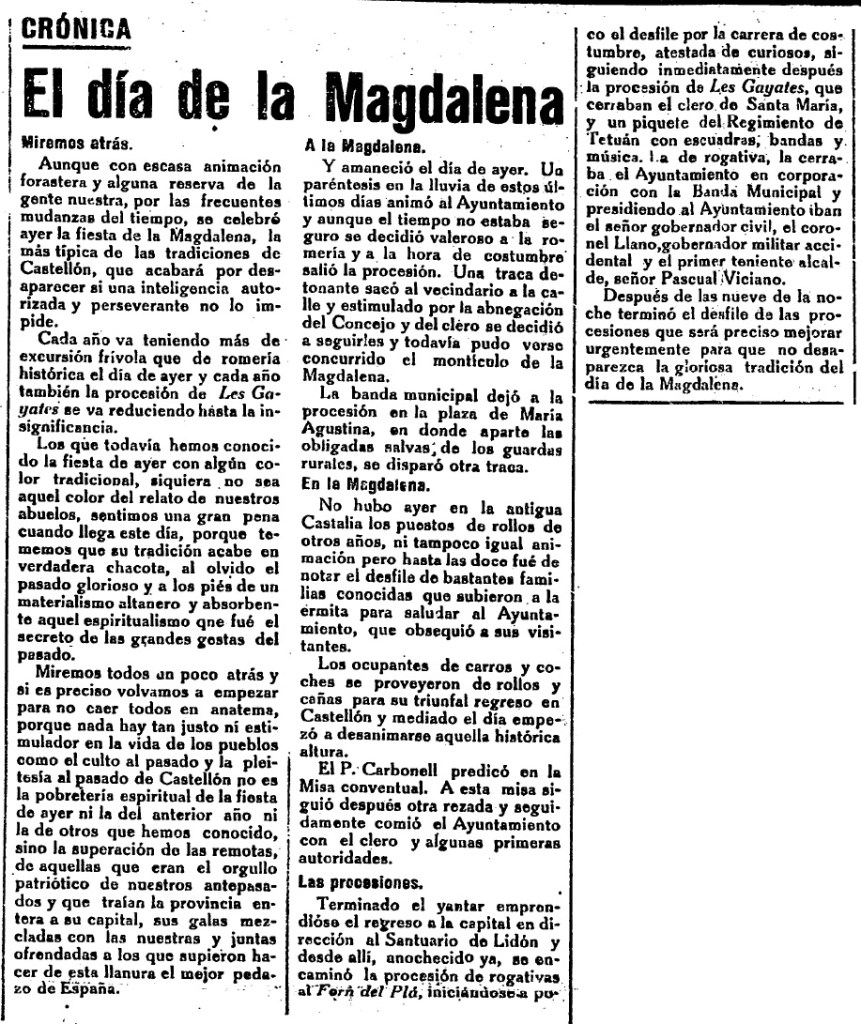 No eran buenos tiempos para la Magdalena. La lectura de la crónica de la fiesta publicada en la portada de Heraldo ese mismo día era muy expresiva e incluía un funesto pronóstico que por fortuna no se cumpliría: «la más típica de las tradiciones de Castellón (…) acabará por desaparecer si una inteligencia autorizada y perseverante no lo impide», porque «cada año va teniendo más de excursión frívola que de romería histórica el día de ayer y cada año también la procesión de Les Gayates se va reduciendo hasta la insignificancia».