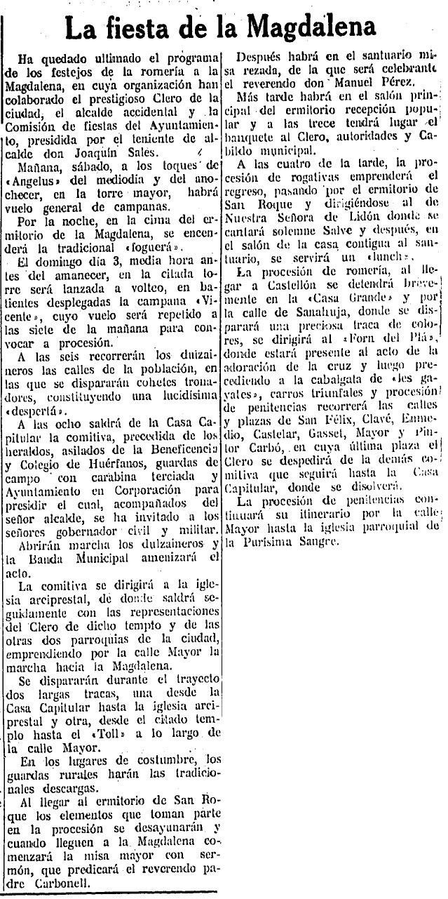Diario de Castellón informaba el viernes 1 de marzo de 1929 sobre los preparativos de la «fiesta de la Magdalena» prevista para el domingo 3. Con todo detalle, el periódico se detenía en cada uno de los actos previstos, desde el vuelo general de campanas a mediodía del sábado hasta el final de «la procesión de penitencias del domingo», pasando por todos los detalles de la romería hasta el solar de los orígenes de Castellón. Entre otras cosas, se da cuenta de que en la noche del sábado, «en la cima del ermitorio de la Magdalena se encenderá la tradicional foguerà» anunciando la festividad del día siguiente. Finalmente, la lluvia obligó a suspender la Romería, que se trasladó al domingo siguiente.