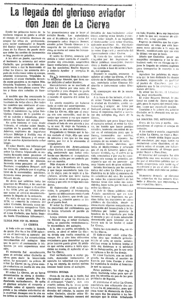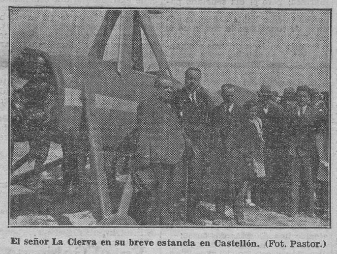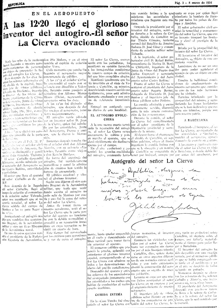 Catorce años después de crear el primer modelo de autogiro, precursor del helicóptero, Juan de la Cierva y Codorniu era, a sus 38 años, una figura reconocida a nivel nacional e internacional. El 8 de marzo de 1934, en mitad de una gira triunfal por todo el país tras haberle sido concedida la distinción de Caballero de la Orden de la República, aterrizaba en el aeródromo de Castellón. El vespertino República se hacía eco de la visita con todo lujo de detalles e incluía la curiosidad de un autógrafo dedicado al propio periódico por el inventor murciano, que no escatimaba elogios: «Para República, después de haber aterrizado en uno de los mejores y desde luego el más bonito de los aeródromos de España».
