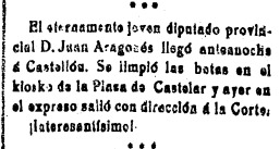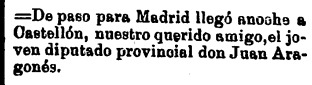 El humor, más concretamente en forma de ironía, es un instrumento empleado habitualmente para la crítica entre los periódicos, tanto locales como nacionales. En marzo de 1914, por ejemplo, una fugaz visita a la capital de la Plana por parte del diputado provincial Juan Aragonés era la excusa idónea para uno de estos rifirrafes de papel. Heraldo de Castellón daba cuenta de la visita en estos términos de rutina…