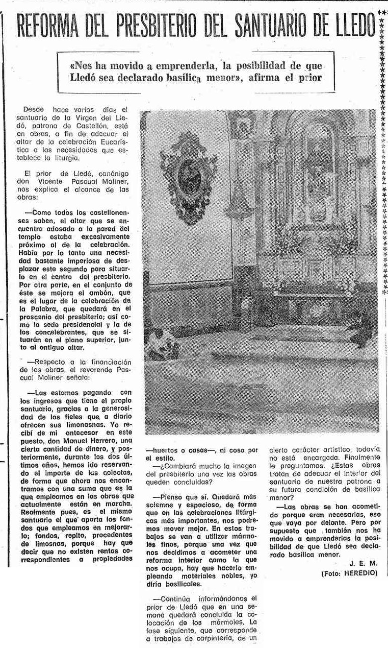 Cuatro años antes de la declaración pontificia del Santuario de la Mare de Déu del Lledó como Basílica Menor, que tendría lugar en marzo de 1983, Mediterráneo informaba sobre unas obras de reforma del presbiterio del templo huertano. En declaraciones a Juan Enrique Mas, el prior Vicente Pascual Moliner admitía que entre las motivaciones de haber emprendido las obras figuraba «la posibilidad de que Lledó sea declarado basílica menor».