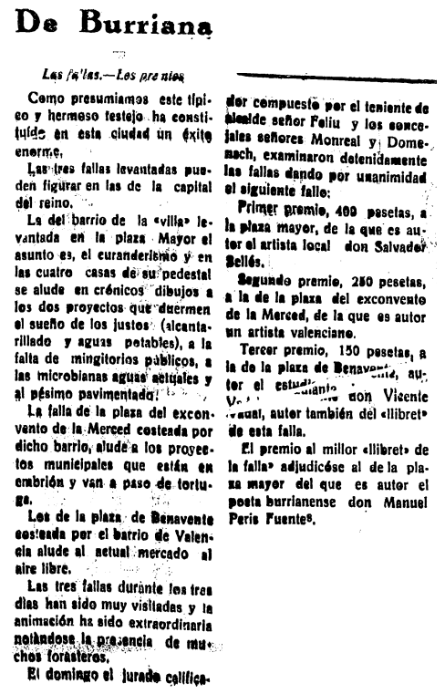 En marzo de 1929, solo un año después de que la plaza de la Merced viera alzarse la primera falla de la historia de Burriana, la población ya contaba con tres monumentos falleros, como se recogía el 20 de marzo en La Provincia Nueva. A la pionera se habían sumado otra falla en la plaza Mayor -hoy Falla Barri La Vila– y otra en la plaza de Benavente «costeada por el barrio de Valencia«. Entre los temas objeto de crítica por las fallas burrianenses -«que pueden figurar en las de la capital del reino»- se encontraban el curanderismo y dos proyectos municipales «que duermen el sueño de los justos (alcantarillado y aguas potables)».