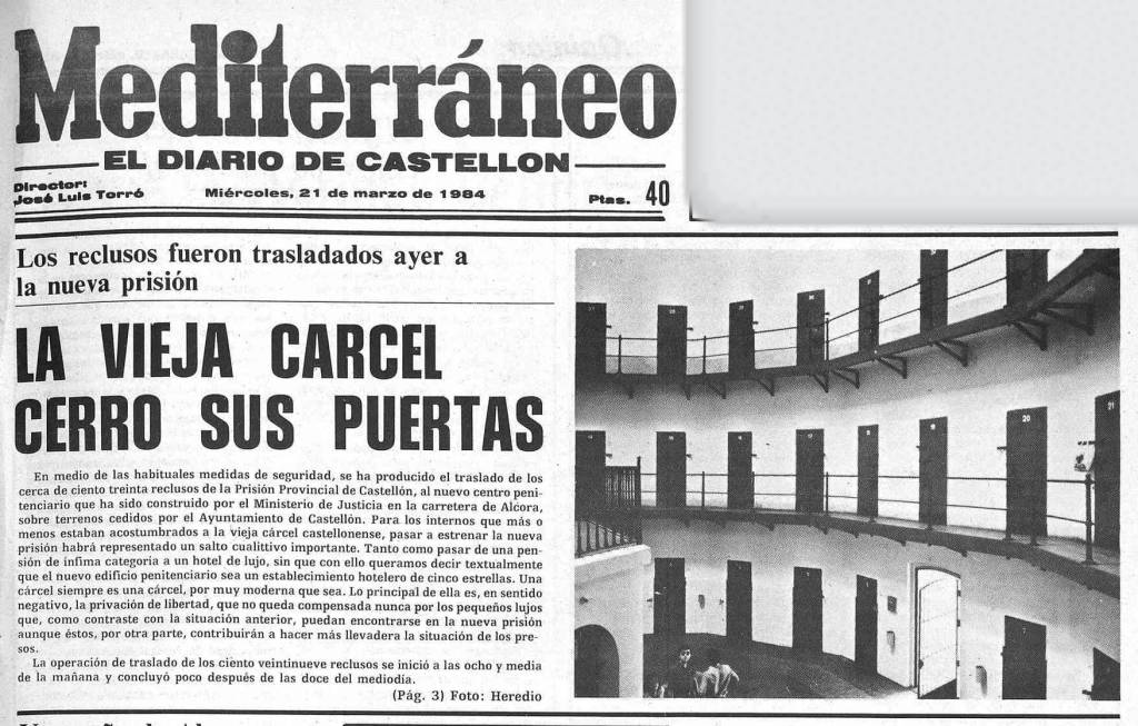 El 21 de marzo de 1984, Mediterráneo abría su portada con la noticia del cierre de la «vieja cárcel» de la Ronda Magdalena, tras el traslado de «cerca de ciento treinta reclusos» al nuevo centro penitenciario construido por el Ministerio de Justicia en la carretera de Alcora, sobre terrenos cedidos por el Ayuntamiento de Castellón. El salto cualitativo, según el diario, era «como pasar de una pensión de ínfima categoría a un hotel de lujo», aunque «una cárcel siempre es una cárcel», como se apresuraba a aclarar el rotativo.