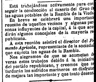 En 1894, se hace realidad una de las principales necesidades del distrito marítimo: los vecinos del Grao de Castellón reciben el ansiado suministro de agua potable, a través de la sociedad Fomento Agrícola Castellonense (Facsa). A finales de marzo, lo anuncia de este modo El Clamor de Castellón, que se felicita «de que se acometan de veras estos trabajos» y subraya que se deben «a la iniciativa del partido republicano», del que el periódico es órgano de expresión.