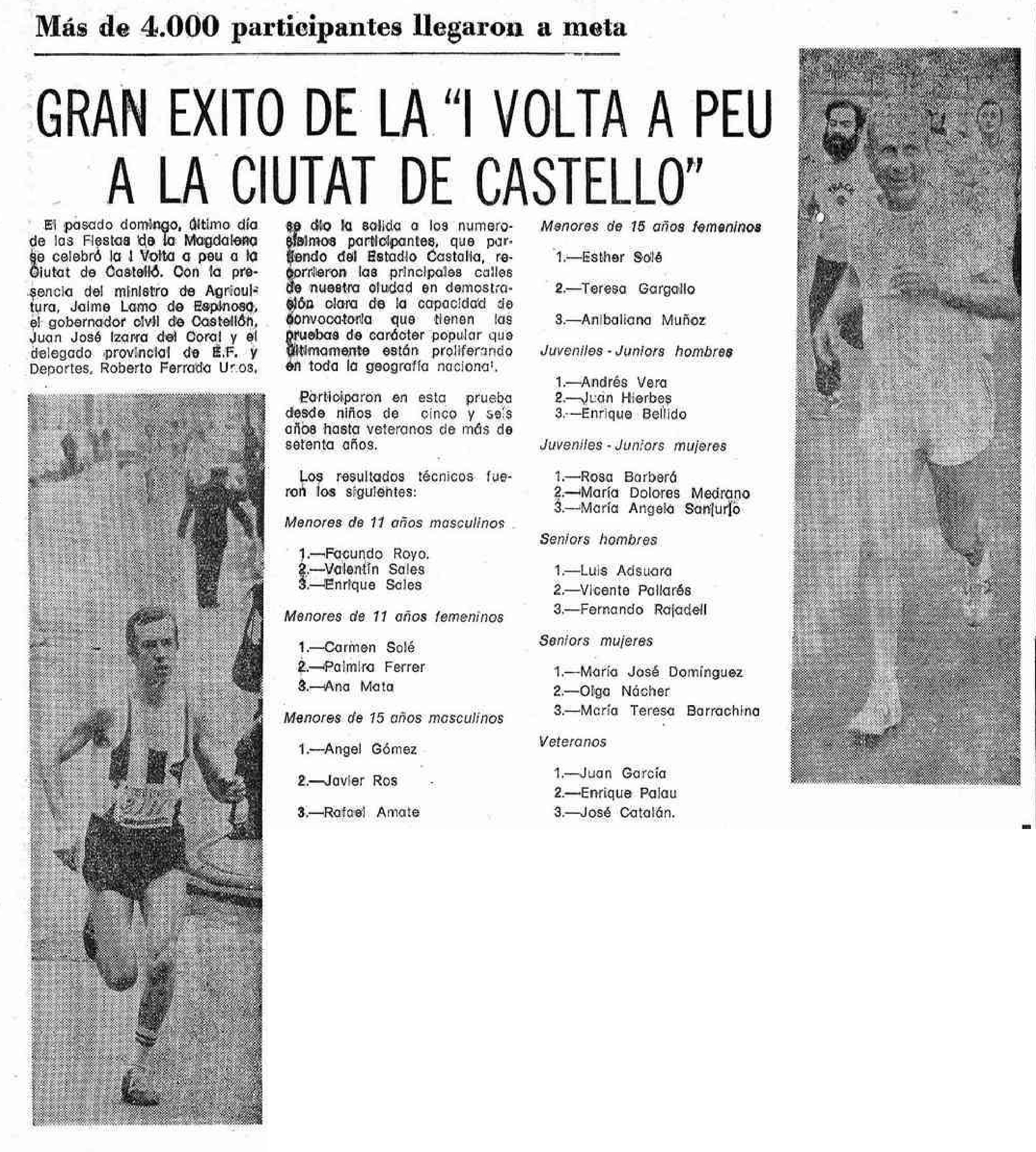 Con salida en el Estadio Castalia, el 26 de marzo de 1979, último día de las fiestas de la Magdalena, se celebraba la primera edición de la Volta a Peu a la Ciutat de Castelló, con más de 4.000 participantes que llegaban a la meta. Según informaba Mediterráneo, Entre los vencedores, Luis Adsuara se imponía en la categoría senior masculina, por delante de Vicente Pallarés y Fernando Rajadell, mientras que María José Domínguez hacía lo propio en la femenina, superando a Olga Nácher y María Teresa Barrachina. Cabe señalar que unos años más tarde, la carrera incorporaría a su nombre la denominación Trofeo Luis Adsuara, que sigue vigente en la actualidad.