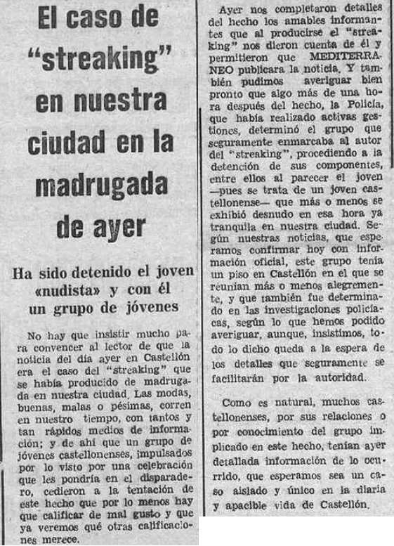«Las modas, buenas, malas o pésimas, corren en nuestro tiempo, con tantos y tan rápidos medios de información». Así valoraba Mediterráneo, tal día como hoy de 1974, un caso de streaking (anglicismo que designa el hecho de correr desnudo en público) producido «de madrugada» en la ciudad. Según el diario, «algo más de una hora después del hecho, la Policía determinó el grupo que seguramente enmarcaba al autor del streaking, procediendo a la detención de sus componentes», entre ellos al parecer el joven castellonense «que más o menos se exhibió desnudo en esa hora ya tranquila en nuestra ciudad».