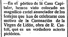 A comienzos de abril de 1924, la ciudad bulle en preparativos de las grandes fiestas de la Coronación canónica de la Mare de Déu del Lledó. Heraldo de Castellón anuncia que en el pórtico del Ayuntamiento de la capital se ha colocado «un magnífico cartel anunciador» de los festejos, «un verdadero acierto pictórico». El 11 de enero se había anunciado el fallo del concurso de carteles, siendo seleccionado el que llevaba por lema Corazón, firmado por Rafael Castell Soliva, hijo menor del pintor Vicent Castell Doménech, quien según señalaría Josep Miquel Francés en su Historia de la Basílica de Lledó «fue realmente» el autor de la obra.