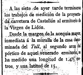 Siete años antes de la inauguración del camino-paseo que uniría la ciudad y el Santuario de la Mare de Déu del Lledó, El Liberal anunciaba el fin de los trabajos de medición «de la proyectada carretera». Así, se cifraba en 1.475 metros los que distaban desde el Toll (actual plaza de María Agustina) hasta el «segundo arco del pórtico» del ermitorio. Asimismo, se cifraba en 15 metros el ancho del futuro vial.