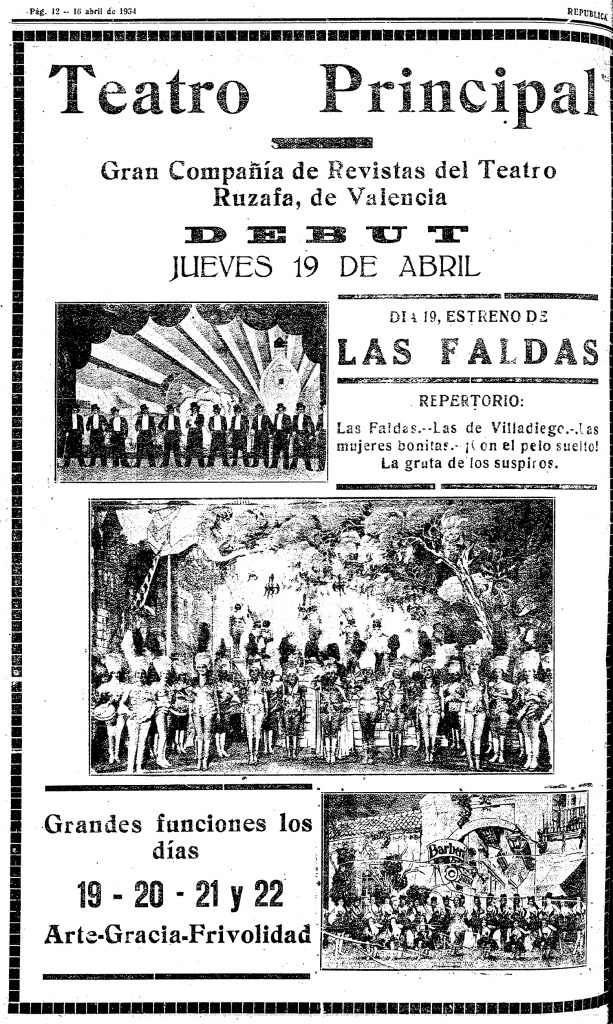 La Gran Compañía de Revistas del Teatro Ruzafa de Valencia anunciaba en el vespertino castellonense República su debut en el Teatro Principal de Castellón para el jueves 19 de abril, con el estreno del pasatiempo cómico-lírico Las faldas, original de Emilio González del Castillo y José Muñoz Román, con música del maestro Ernesto Pérez Rosillo. Al promocionar sus cuatro días de funciones en la capital de la Plana, la empresa prometía a los espectadores «arte», «gracia» y «frivolidad».