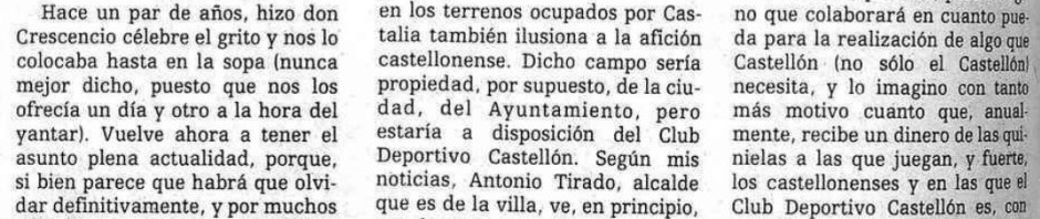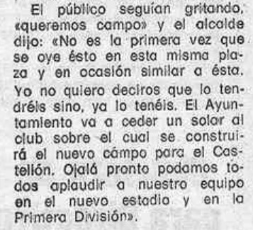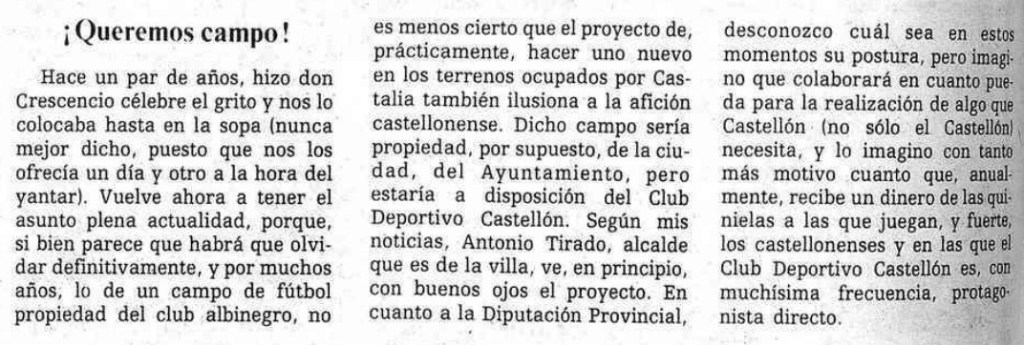 La operación se fue finalmente al traste, pero la petición de un nuevo campo no cesaba. El clamor popular de 1981 fue recogido como un guante y en los años siguientes repetido hasta la saciedad por Crescencio López del Pozo, Chencho, en sus programas en Radio Castellón. Y en abril de 1984, Jesús Martínez Mira retomaba así el tema en su sección La otra crónica en Mediterráneo: «si bien parece que habrá que olvidar definitivamente, y por muchos años, lo de un campo de fútbol propiedad del club albinegro, no es menos cierto que el proyecto de, prácticamente, hacer uno nuevo en los terrenos ocupados por Castalia también ilusiona a la afición castellonense». Como es sabido, aún faltaban más de tres años para la inauguración del Nou Castalia, el 17 de junio de 1987.