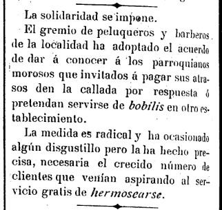 Las deudas acumuladas por algunos clientes de peluquerías y barberías llevaban a este gremio de profesionales castellonenses a adoptar una medida «radical», en la primavera de 1904. «La solidaridad se impone», proclamaba en su noticia Heraldo de Castellón: la decisión sería sencillamente la de «dar á conocer a los parroquianos morosos que invitados a pagar sus atrasos den la callada por respuesta o pretendan servirse de bóbilis en otro establecimiento». Es decir, publicar sus nombres.