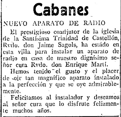 La primera emisora de radio española se pone en marcha en 1924. Cinco años después, este medio de comunicación se abre paso poco a poco en nuestro país, pero su presencia en los hogares aún es excepcional. Por ello, Diario de Castellón celebra con esta noticia la novedad de la instalación de un «magnífico aparato» de radio en casa del cura de Cabanes, reverendo Enrique Martí. El mérito corresponde a otro sacerdote, Jaime Sagols, «prestigioso» coadjutor de la parroquia de la Santísima Trinidad de la capital de la Plana.