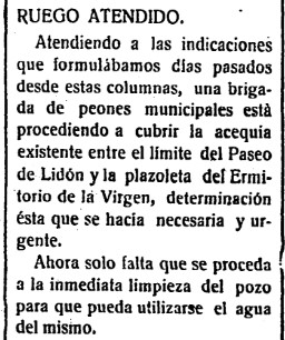 Solo dos semanas antes del inicio de las grandes fiestas de la Coronación pontificia y canónica de la Mare de Déu del Lledó, a finales de abril de 1924, una brigada de peones municipales realiza una pequeña obra imprescindible, «atendiendo a las indicaciones» formuladas desde Heraldo de Castellón unos días antes. Se trata de la cubrición de «la acequia existente entre el límite del Paseo de Lidón y la plazoleta del Ermitorio de la Virgen». A juicio del periódico, solo quedaría pendiente un detalle: «la inmediata limpieza del pozo para que pueda utilizarse el agua del mismo».