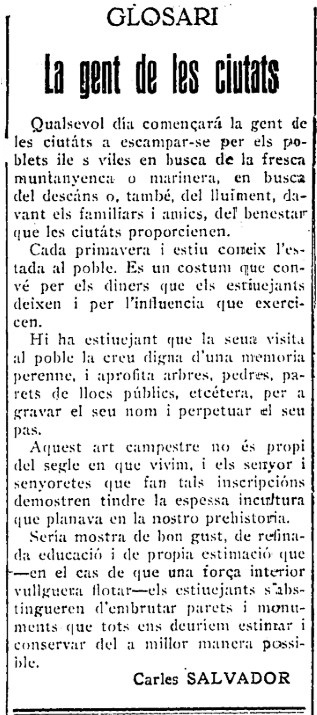 El poeta y gramático Carles Salvador colabora de forma habitual con los medios de comunicación castellonenses en los años 20 del siglo XX. En este breve artículo publicado por el Diario de la Mañana a finales de abril de 1929, dirige una crítica acerada a algunos veraneantes de las ciudades que suelen grabar sus nombres en piedras, árboles o paredes de espacios públicos, al creer digna su visita de una memoria «perenne». «Aquest art campestre no és propi del segle que vivim», concluye, pidiendo a los capitalinos que apliquen el autocontrol como muestra «de bon gust, de refinada educació i de pròpia estimació».