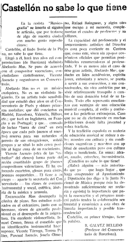Dos años después de la puesta en marcha del primer Conservatorio de Música de Castellón, en 1932, la revista Musicografía publicaba un artículo del compositor jiennense Bernardino Gálvez Bellido, del que se hacía eco Diario de Castellón a comienzos de mayo de 1934. Su opinión, desde el título, es muy clara: «Castellón, el lindo florón de la Plana, no sabe lo que tiene» en materia musical, en alusión al propio conservatorio, del que elogiaba «enseñanzas con ventajas de una educación musical completa, al estilo y conforme a las prácticas extranjeras».