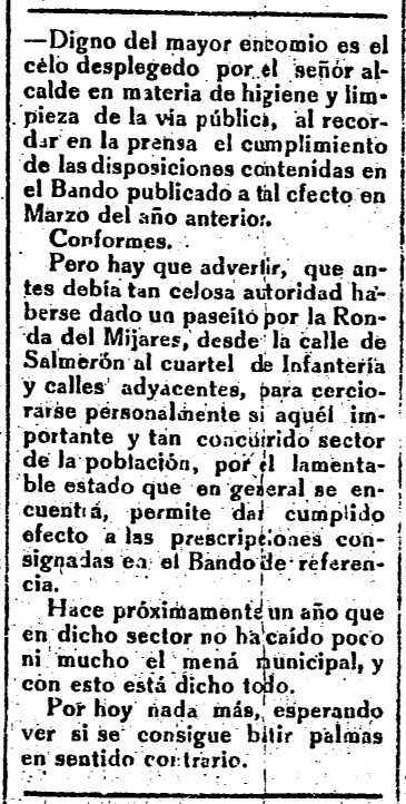 A lo largo de las décadas, la limpieza de las calles es objeto habitual de atención por parte de la prensa local. Así, en una primavera a finales de los años 20, Heraldo de Castellón agradece con un «conformes» el «celo desplegado por el señor alcalde» Manuel Lillo Roca en la materia de la higiene pública, para criticar a continuación que «antes debía tan celosa autoridad haberse dado un paseíto por la Ronda del Mijares, desde la calle Salmerón (hoy Navarra) hasta el cuartel de Infantería (hoy plaza Botánico Calduch) y alrededores».