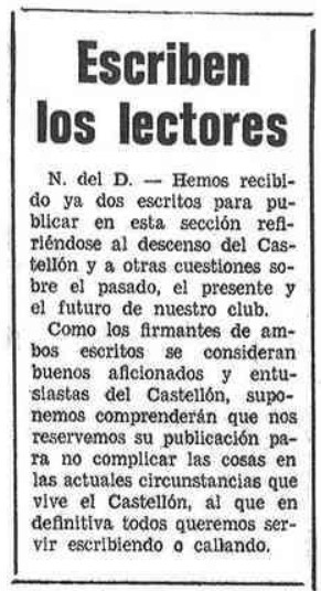 Solo tres días después de confirmarse el descenso del CD Castellón a Segunda División, Mediterráneo publica esta nota titulada Escriben los lectores para explicar los motivos de la no publicación de «dos escritos» recibidos en la redacción «refiriéndose al descenso» del club. El rotativo argumenta su decisión porque «como los firmantes se consideran buenos aficionados», supone que «comprenderán que nos reservemos su publicación para no complicar las cosas». Su conclusión es tajante: «todos queremos servir» al equipo albinegro «escribiendo o callando».