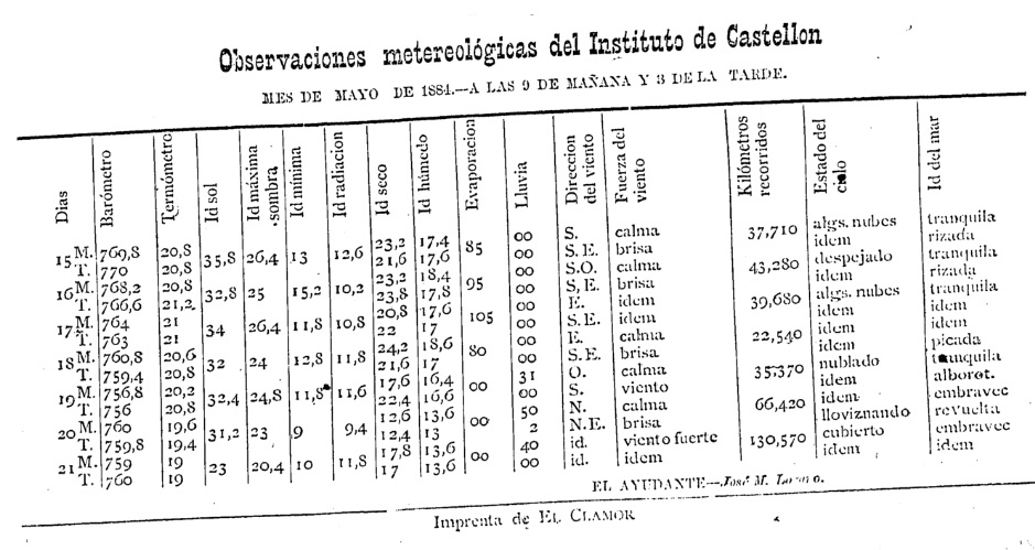 Aunque hasta 1911 el observatorio meteorológico del instituto de Castellón no se integrará en la red oficial, su creación en el curso 1879-1880 por parte del director y catedrático de Física y Química Francisco Llorca hará que la prensa se interese por publicar sus «observaciones». En mayo de 1884, El Clamor recoge sus datos de forma semanal, con gran precisión, desde la información del barómetro a la del termómetro, la radiación, las lluvias, la dirección y fuerza del viento y los estados del cielo y la mar tanto a las nueve de la mañana como a las tres de la tarde. El observatorio se sitúa en el instituto, ubicado en la calle Mayor, sobre el suelo que hoy ocupa la plaza de Santa Clara.