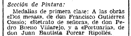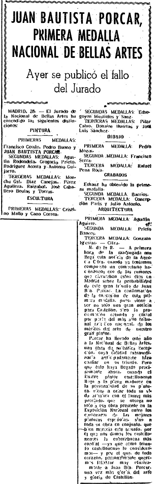 Dos años después de ser nombrado Hijo Predilecto de Castellón, Juan Bautista Porcar Ripollés alcanza el cénit de su prestigio artístico al obtener en 1954 la Primera Medalla Nacional de Bellas Artes, junto a Francisco Gutiérrez Cossío y Pedro Bueno, como se recoge en Mediterráneo. El galardón a Porcar se debe a su obra Portuaria, como se recogerá en el BOE del 15 de junio.
