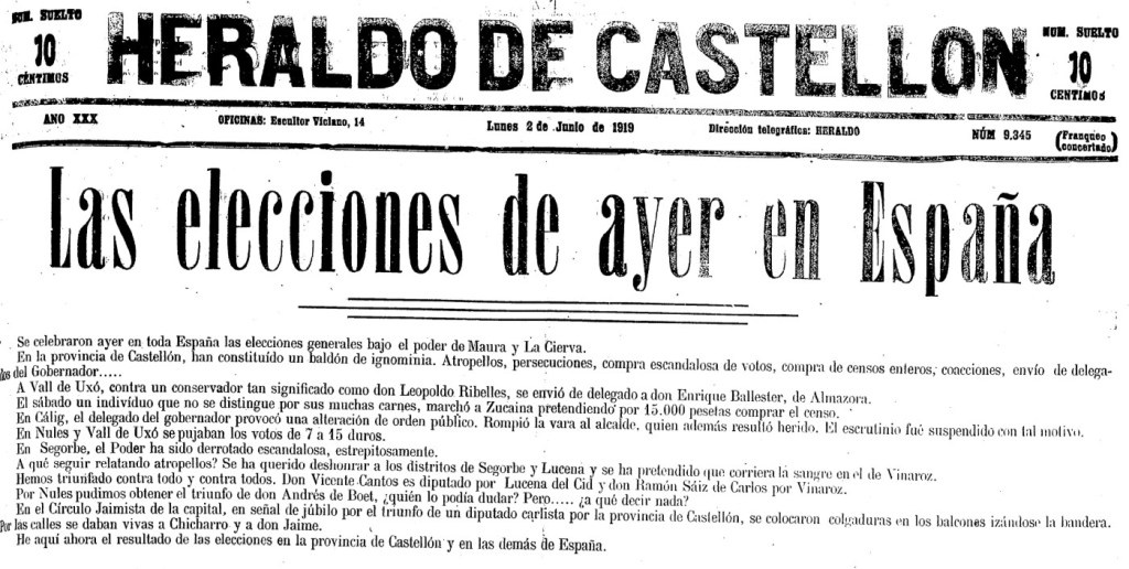 La legislatura que se abre tras las elecciones del 1 de junio de 1919 es una de las últimas de la Restauración, a solo cuatro años de la Dictadura de Primo de Rivera. La victoria corresponde a las huestes conservadoras de Antonio Maura, pero el fraude, el caciquismo y el clientelismo reinantes condicionan el resultado electoral y son objeto de atención por la prensa. En nuestra provincia, Heraldo de Castellón recoge un catálogo de irregularidades en su portada, repasando incidencias en numerosas poblaciones: