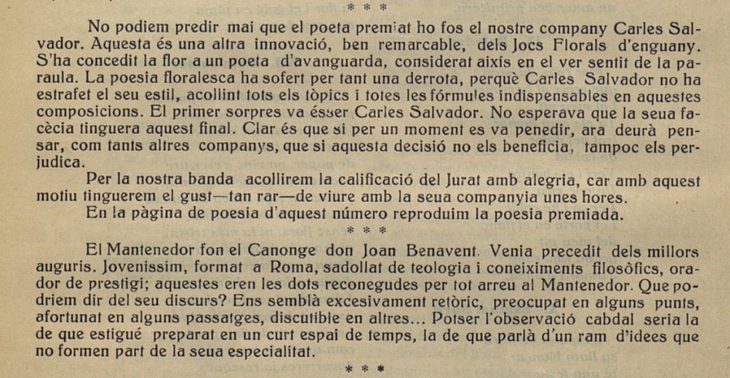 Y es que solo unos días antes de la publicación de su artículo, Carles Salvador ha recogido la Flor Natural en los Juegos Florales de València, un acto en el que debió producirse la intervención de Benavent como mantenedor, tal y como recuerda la edición del 1 de junio de Taula de Lletres Valencianes, en la que se muestra una visión bastante menos complaciente de la intervención del canónigo: