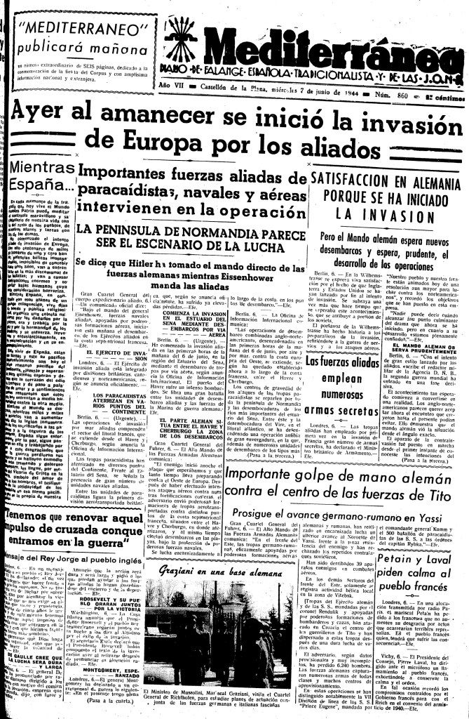 El 6 de junio de 1944 es conocido históricamente como el Día D por su impacto en la evolución de la II Guerra Mundial. El desembarco aliado en Normandía es recogido en las portadas del día siguiente por toda la prensa. A cinco columnas, con el titular Ayer al amanecer se inició la invasión de Europa por los aliados, Mediterráneo anuncia así la noticia a sus lectores, llamando la atención sobre el contraste de la situación bélica europea con la paz en España, que «en contraste con los afanes de un mundo enloquecido, vive días de honda y pública religiosidad, [por el Corpus Christi] organiza una colecta nacional por los dañados de la guerra, ora y trabaja por la paz y la hermandad de los hombres y se esfuerza, fervorosa y entusiásticamente, en su reconstrucción y en su engrandecimiento». El periódico destaca que España es «el único remanso pacífico del continente».