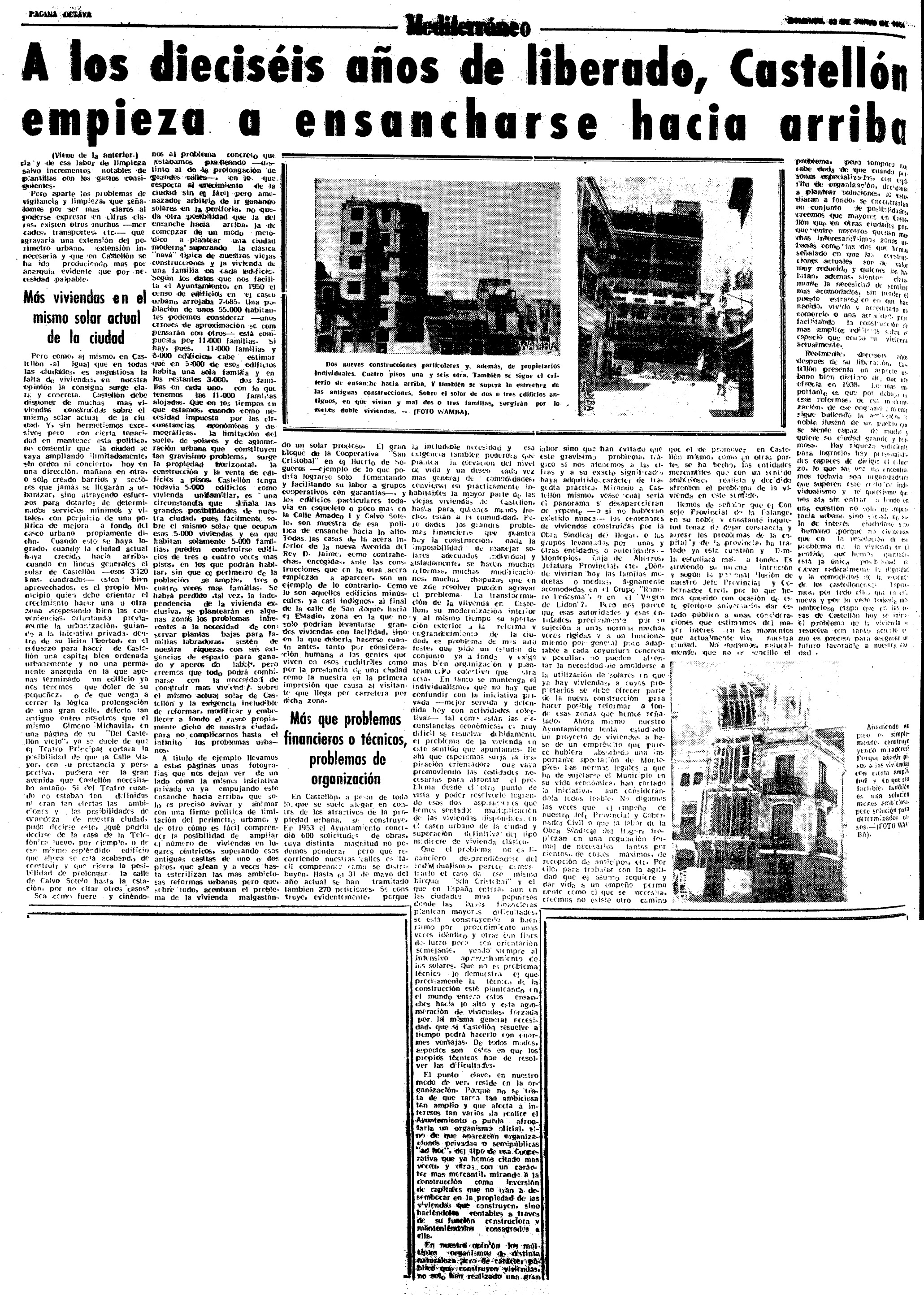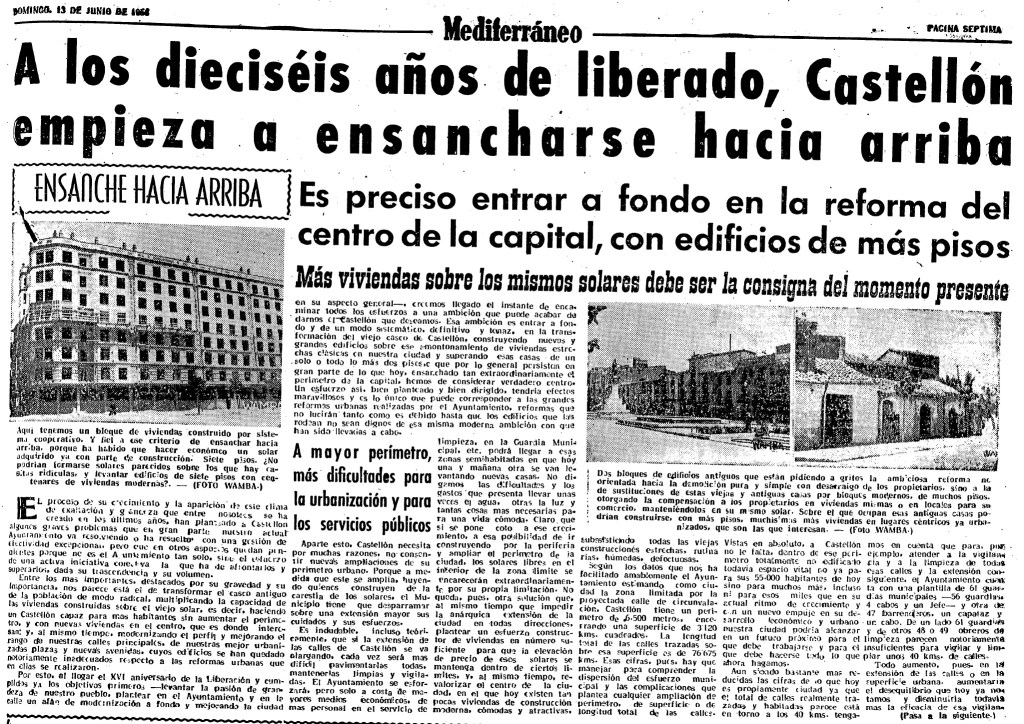A mediados de los años 50, la explosión demográfica de la capital de la Plana empieza a manifestarse en hechos como el nacimiento del barrio de Benadresa. Pero aparte del surgimiento de grupos periféricos, Mediterráneo subraya cómo la ciudad «empieza a ensancharse hacia arriba», poniendo como ejemplo construcciones como las de la plaza Huerto Sogueros. El periódico considera «preciso» incidir en la reforma del centro de la ciudad, «con edificios de más pisos».