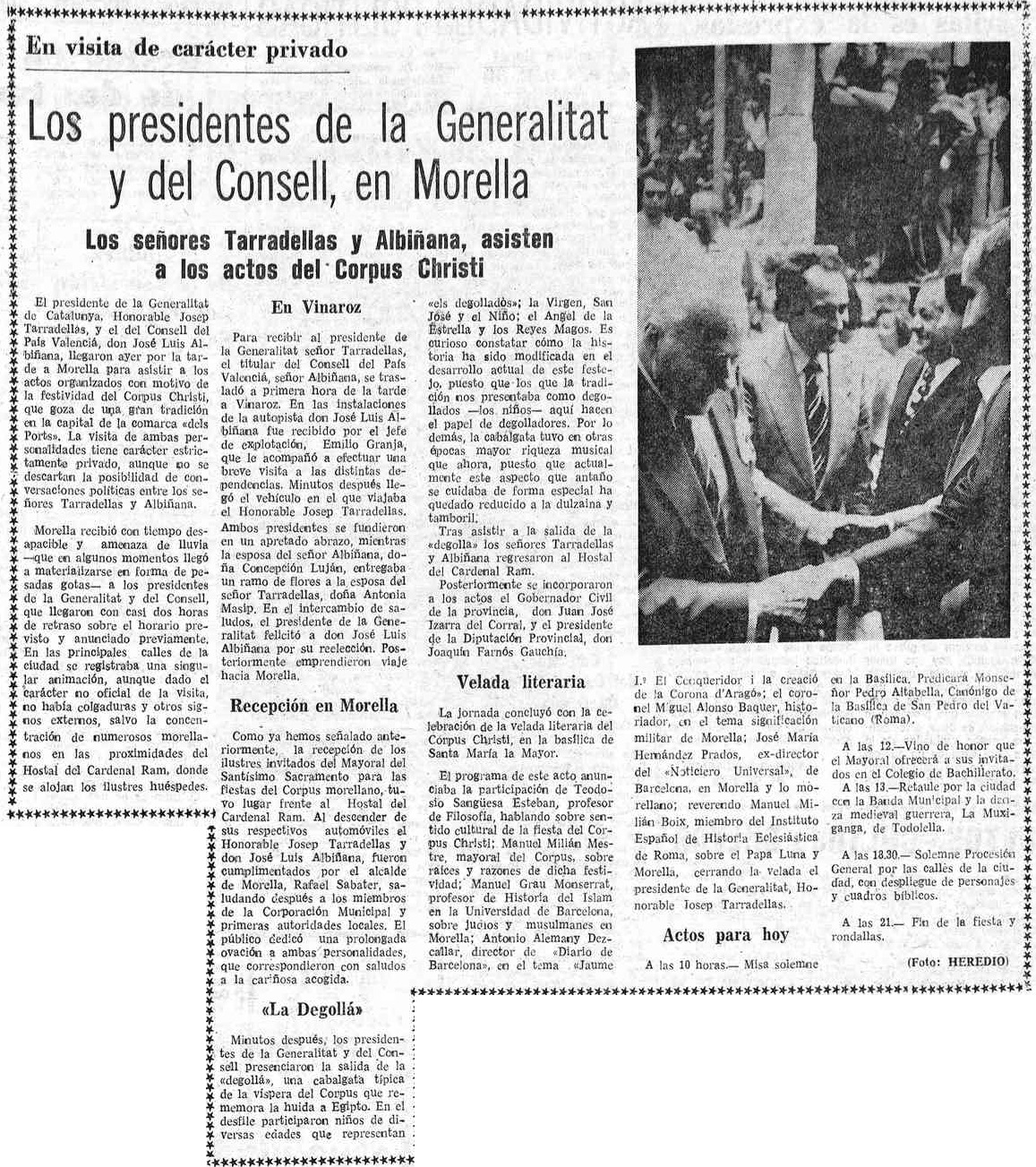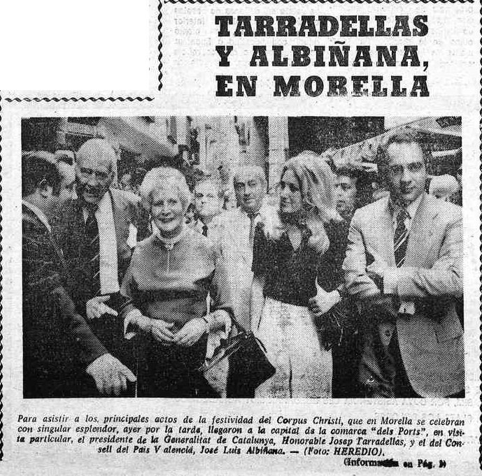 La festividad del Corpus Christi de 1979 depara en Morella un encuentro entre el presidente de la Generalitat de Catalunya, Josep Tarradellas, y el presidente del Consell preautonómico valenciano, Josep Lluís Albiñana, ambos alojados en el hostal (hoy hotel) Cardenal Ram. Ambos llegan a la capital de Els Ports en viaje privado, pero comparten una velada literaria -con la participación entre otros de Manuel Milián, como mayoral del Corpus- y antes, a su llegada, son recibidos por el primer alcalde democrático de Morella, Rafael Sabater.