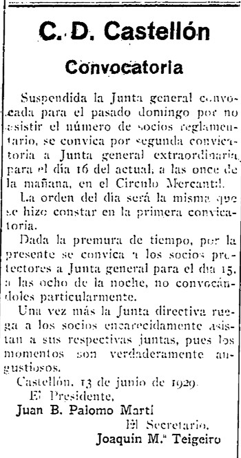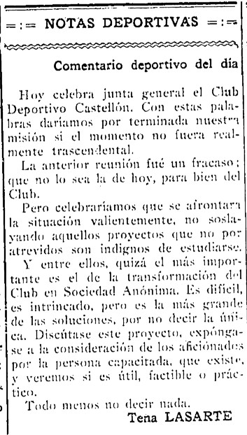 Manuel Tena Lasarte firma en junio de 1929, a punto de cumplirse siete años de la fundación del CD Castellón, este «comentario deportivo» en el Diario de la Mañana, ante la celebración de una junta general de la entidad en un momento «realmente trascendental», como se muestra en la convocatoria publicada en el propio periódico, según la cual «los momentos son verdaderamente angustiosos» para el club presidido por el cirujano Juan Bautista Palomo Martí. La noticia señala como «la más grande de las soluciones, por no decir la única», la transformación de la entidad en sociedad anónima. En la asamblea, se decidiría el estudio de la medida por parte de una junta especialmente nombrada al efecto, sin más consecuencias.