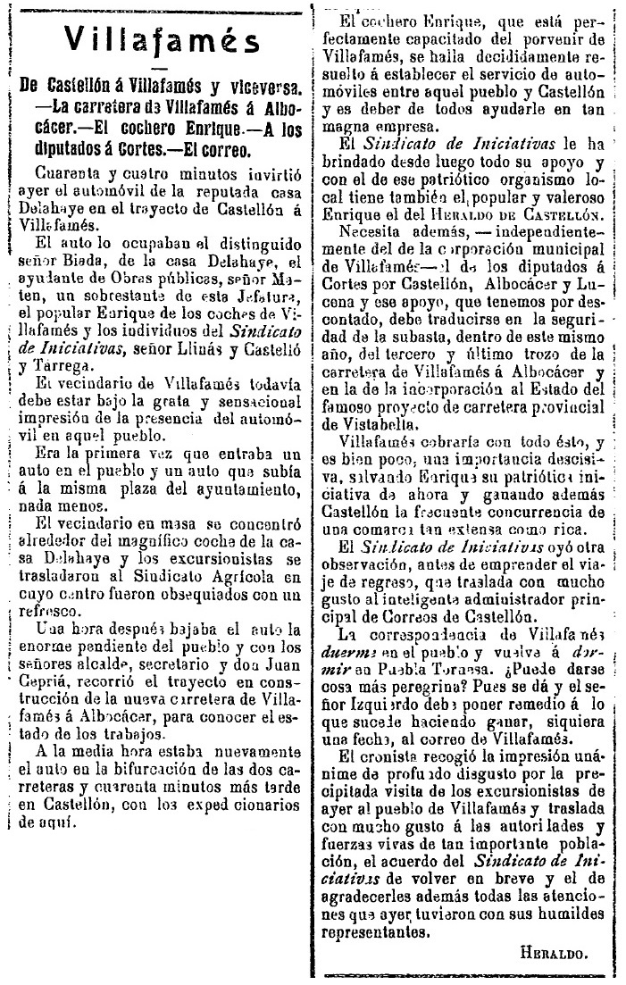 «Era la primera vez que entraba un auto en el pueblo y un auto que subía a la misma plaza del ayuntamiento, nada menos». De este modo destaca Heraldo de Castellón, a mediados de junio de 1909, la impresión de los vecinos de Vilafamés al ver por vez primera un automóvil. «El vecindario en masa se concentró alrededor del magnífico coche de la casa Delahaye» (fabricante francés de automóviles de lujo) después de su llegada desde Castellón en apenas 44 minutos. Entre los «excursionistas» destaca la presencia del cronista de la capital y fundador del Diario de Castellón, Carlos Llinás, y el concejal y fundador del propio Heraldo, José Castelló y Tárrega, miembros ambos del recién fundado Sindicato de Iniciativas.