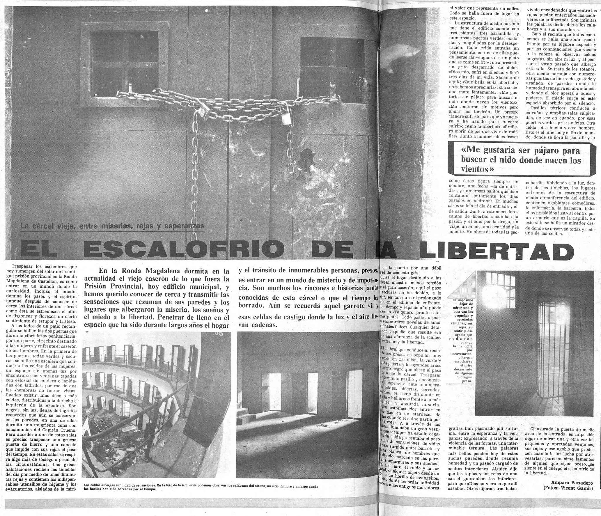El cierre, en marzo de 1984, de la vieja prisión provincial ubicada en la Ronda Magdalena, es una noticia relevante en la ciudad, que asiste al traslado de los presos al nuevo centro penitenciario de la carretera de Alcora. Solo tres meses después, ese «viejo caserón», edificio municipal, es visitado por los reporteros Amparo Panadero y Vicent Gamir, de Mediterráneo. Las celdas «son negras, sin luz, llenas de ingratos recuerdos que aún se conservan en las paredes, en una de ellas dormita una mugrienta cuna con calcamonías del Capitán Trueno». El reportaje, titulado El escalofrío de la libertad, narra cómo entrar a la prisión «es entrar en un mundo de misterio y de impotencia», y explica que en sus estancias se conservan pintadas de los reclusos, como la de «Madre, sufriste para que yo naciera y he nacido para que hacerte sufrir».