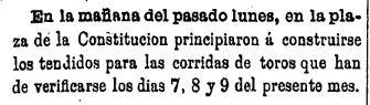 Los festejos de julio son importantes en la ciudad de finales del siglo XIX, y dentro del programa, los actos taurinos en la plaza de la Constitución -hoy Mayor- ocupan un lugar central, del que ha quedado incluso memoria gráfica. Así, El Clamor de la Democracia se hace eco a comienzos de mes del inicio de los trabajos para la construcción de la plaza portátil para las corridas previstas en los días 7, 8 y 9 de julio de 1884. Al año siguiente comenzarían las obras de la futura plaza de toros de Castellón, inaugurada en 1887, que sustituiría a la antigua, ubicada donde hoy se alza el instituto Francisco Ribalta.