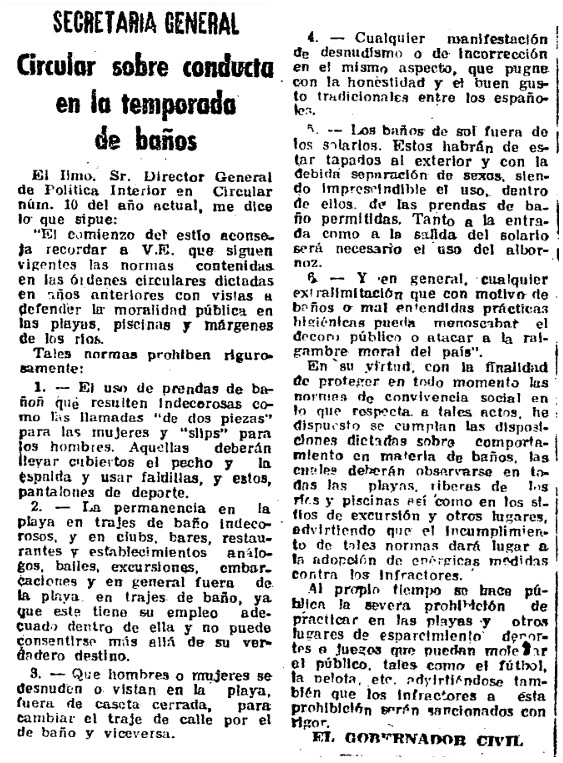Entre otras cosas, se prohíbe «rigurosamente» el uso de prensa «indecorosas» como «las llamadas de dos piezas para las mujeres y slips para los hombres». Se señala con gran precisión que el uso del traje de baño «no puede consentirse más allá de su verdadero destino». Finalmente, se apercibe contra «cualquier extralimitación» que pueda «menoscabar el decoro público o atacar a la raigambre moral del país», advirtiéndose de la adopción de «enérgicas medidas» contra los infractores.